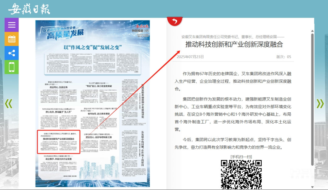 在此次備受矚目的大會上,奇瑞控股、科大訊飛等 8 家行業領軍企業及合肥市、蕪湖市代表紛紛登臺,分享各自的寶貴經驗,共同描繪未來發展藍圖。安徽叉車集團黨委書記、董事長、總經理楊安國作為國企代表,其發言更是引發了媒體的廣泛關注。