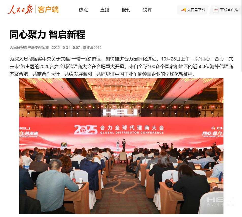 10月28日至31日,“同心?合力?共未來”2025合力全球代理商大會在合肥召開,引發媒體廣泛關注,新華社安徽分社、中央廣播電視臺安徽總站、經濟日報、證券日報、央廣網、中國工業報、人民網安徽頻道、新華網安徽頻道、安徽日報、安徽新聞聯播等28家媒體、46名記...